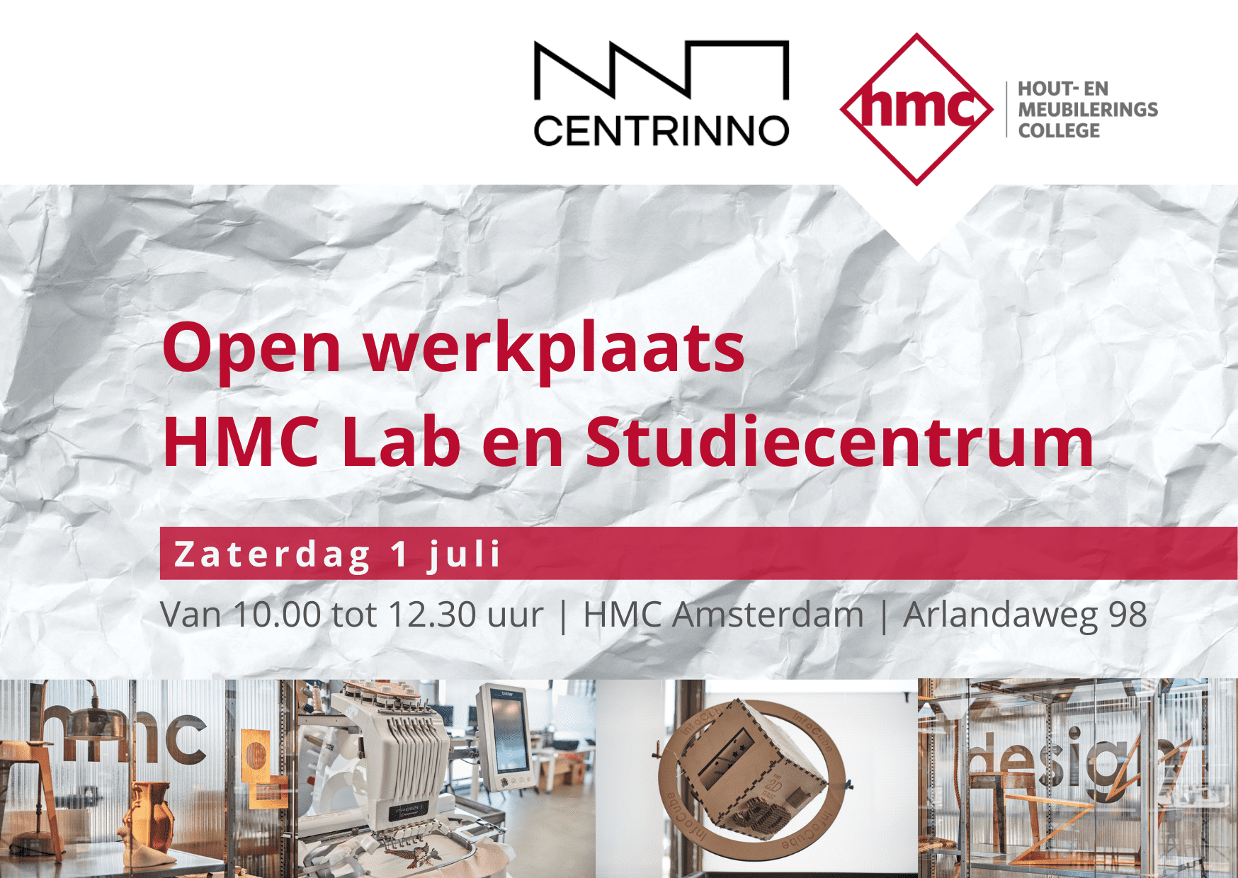 - Rondleiding HMC-Lab en Studiecentrum: Van welke machines uit het Lab wil jij in de toekomst gebruik maken? Wij vertellen meer over de verschillende machines in het Lab en tonen o.a. de 3D-printer, lasersnijder, borduurmachine, watersnijder en vinylsnijder. Ook laten we jou onze materialenkast en bibliotheek zien. Je kunt hier kennis opdoen over de mogelijkheden van materialen gemaakt van reststromen. Ook vind je informatie over alternatieven voor milieubelastende materialen en productieprocessen.
