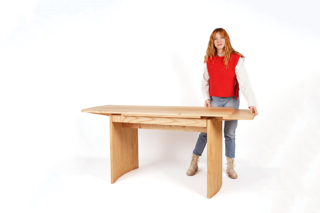 De tafel is gemaakt om tijdloos en toch modern te zijn. Dit meubel is ontworpen voor studentenwoningen en past zich door het uitschuifmechanisme aan elke ruimte. De uitdaging bij dit ontwerp was het blad weer op dezelfde hoogte uit te laten komen na het in- en uitschuiven. Het was voor mij van belang dat de extra bladen niet los hoeven worden opgeborgen.