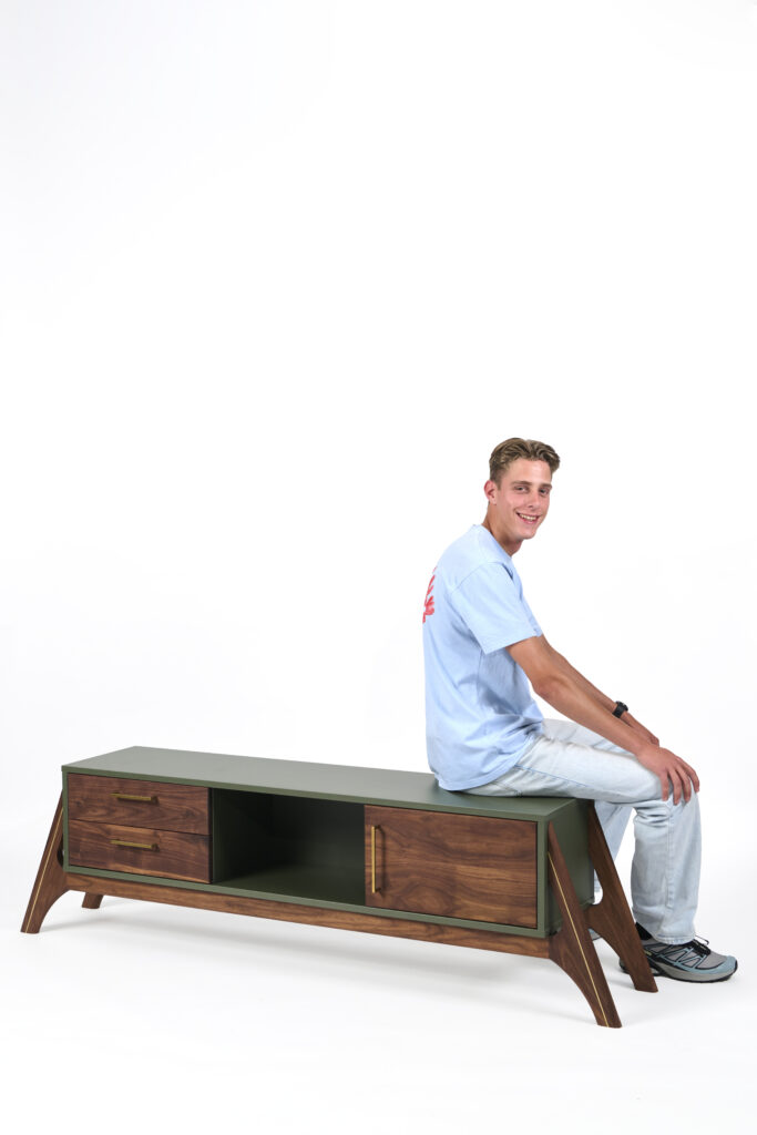 Dit meubel is ontworpen als een veelzijdig stuk dat zowel functioneert als tv-meubel én als eyecatcher in je interieur. Ik wilde graag iets origineels creëren dat opvalt en een eigen verhaal vertelt. Het ontwerp straalt luxe en natuurlijkheid uit, dankzij de zorgvuldig gekozen kleuren en materialen. De combinatie van warme tinten en hoogwaardige materialen geeft het meubel een unieke uitstraling die direct opvalt in elke ruimte. Wat dit meubel echt bijzonder maakt, zijn de subtiele messing details en het opvallende onderstel. Samen zorgen die voor een elegante en verfijnde look. Door het gebruik van bijzondere materialen en kleuren ontstaat er een evenwichtig en stijlvol geheel. Dit meubel is niet alleen praktisch, maar ook een stijlvol statement voor in huis. Met oog voor detail en design heb ik iets gecreëerd dat past in elk modern interieur.