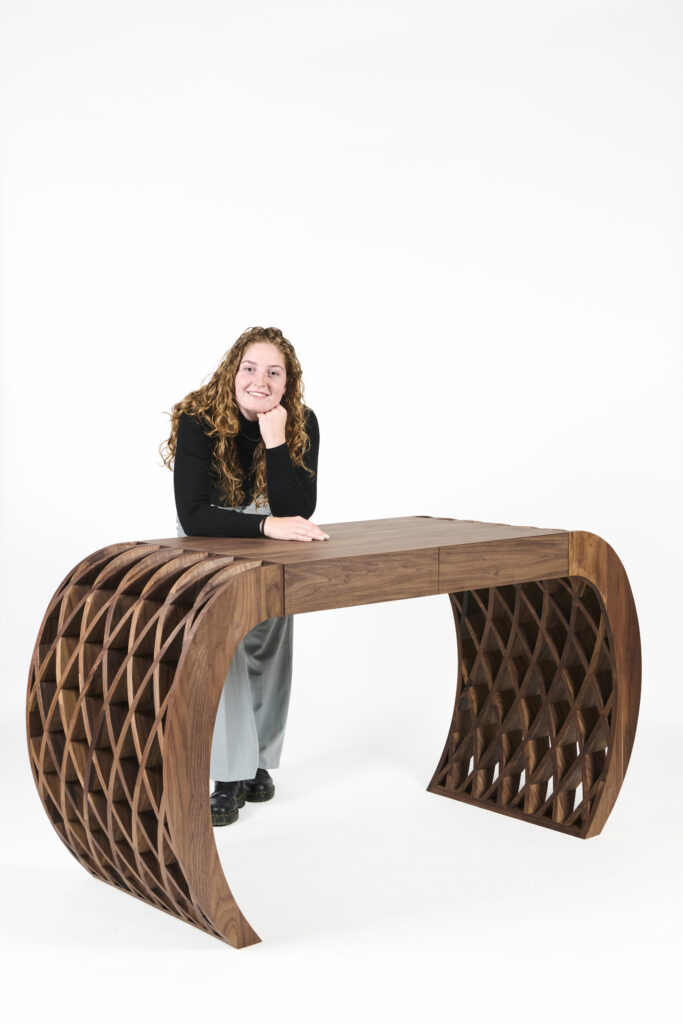 Tijdens het maken van dit dressoir, heb ik gebruik gemaakt van Amerikaans notenhout, dit heb ik vervolgens met de 5-assige CNC bewerkt. Na het programmeren zijn de grove vormen van het raster en de verbindingen uitgefreesd. Ik heb door middel van handwerk de rondingen nabewerkt en tot het eindresultaat gevormd. Het meubel is aan beide kanten afgewerkt, zodat het de mogelijkheid heeft om midden in een ruimte te kunnen staan. Het meubel vraagt namelijk om van alle kanten bekeken te worden. Het dressoir heet Noce Novo, “novo” betekent “nieuw” in het Portugees, een moderne draai aan een klassiek materiaal.