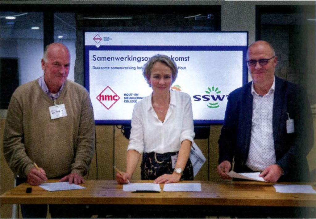 Foto door Kees de Vries: SSWT-coördinator Dick Teerling, NBvT-directeur Taco Schoonderwoerd en HMC-bestuurslid Joke Bos tekenen de overeenkomst ‘Duurzame Samenwerking Industrieel Bouwen met Hout’ om de afstand tussen leerlingen en bedrijven uit de timmerindustrie weg te nemen.