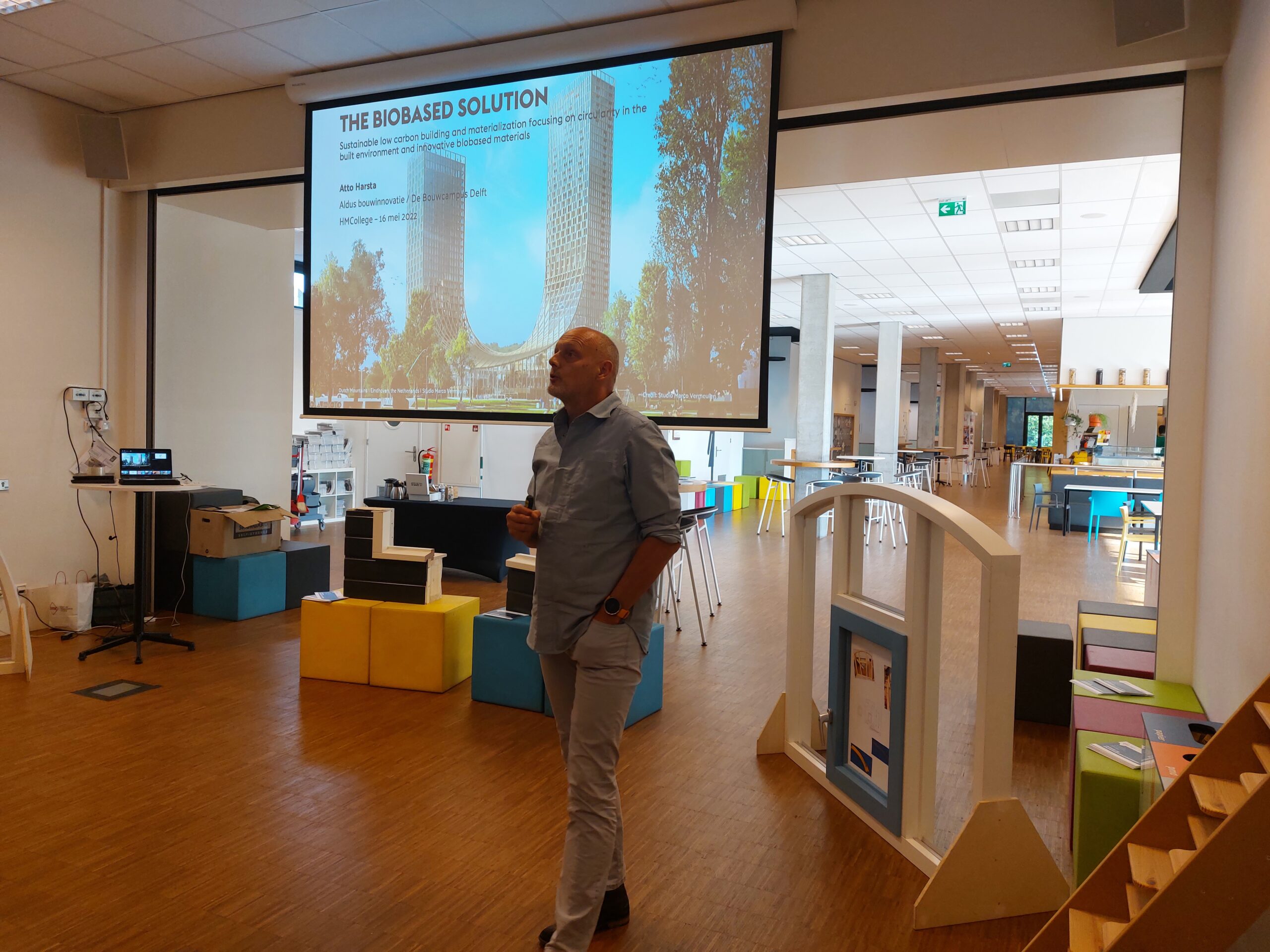 Gastspreker Atto Harsta, medeschrijver van het boek ‘De Houtbouw Revolutie’, vertelde namens het PEFC over het principe van biobased bouwen. Hij nam de aanwezigen mee in de laatste ontwikkelingen van prefab houtbouw, de voordelen van Mass-Timber en de toepassingsmogelijkheden van de laatste generatie houtproducten. Daarnaast wierp hij licht op het idee materialen terug te winnen uit de bouw. “Wanneer we de stap van houtbouw naar het hergebruik van materialen weten te zetten, komt de circulariteit van onze grondstof pas echt op gang,” legde Atto uit tijdens zijn presentatie. Ook bevestigde Atto de noodzaak van de instroombevordering van de branche. “Als er niet méér opgeleide medewerkers de branche in komen, blijven de landelijke ambities slechts een plan. In verschillende steden wordt steeds meer in hout gebouwd en is steeds duidelijker zichtbaar dat hout een serieuze vervanger is voor beton en staal.”