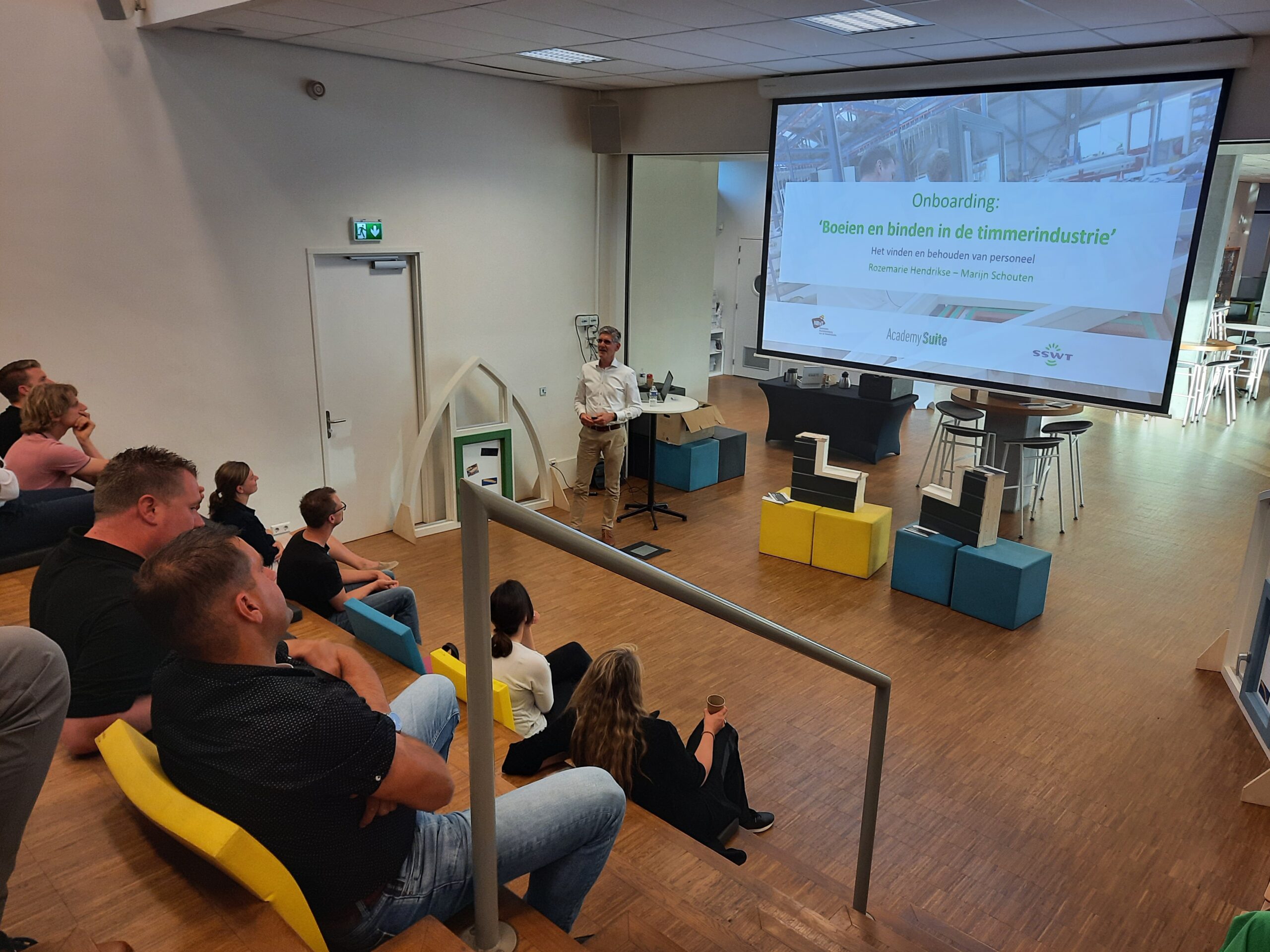 Het inwerken van nieuwe medewerkers gebeurt veelal op de vloer en in het werk. Dit kost tijd, energie en personele inzet, kortom geld. Marijn Schouten en Rozemarie Hendrikse van Academy Suite namen de aanwezigen mee in het begrip ‘onboarding’. Hoe kun je het beste personeel werven en hoe zorg je dat het personeel zich welkom blijft voelen in het bedrijf? Hiervoor is een oplossing: een online platform zorgt ervoor dat nieuwe medewerkers de DNA van het bedrijf leren kennen. Door middel van verschillende oefenmodules krijgen ze informatie over bijvoorbeeld de bedrijfsprocessen en de CAO. Door een goede ‘onboarding’ is aangetoond dat medewerkers tot wel 54% effectiever zijn, er een 17% hogere opbrengst per medewerker kan worden behaald en de medewerkerstevredenheid met wel 50% kan toenemen!