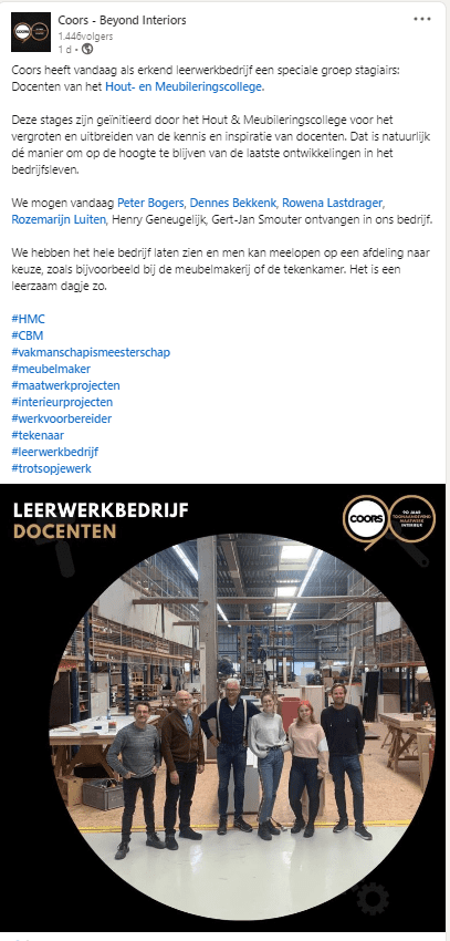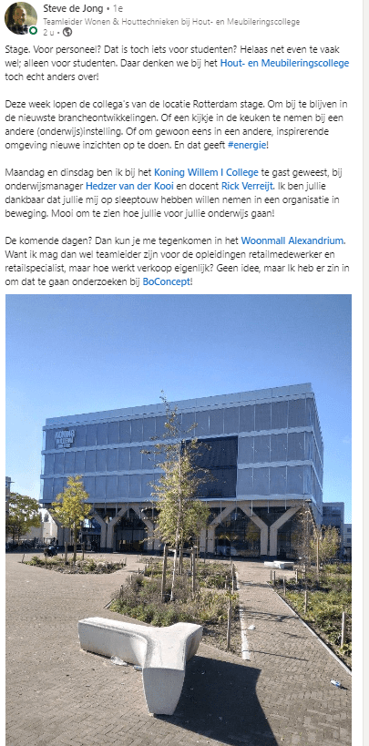 Alle medewerkers moesten zelf een stageplek vinden. De plekken zijn zeer uiteenlopend. Zo zijn er medewerkers die stage lopen bij huidige stagebedrijven. Medewerkers die een kijkje nemen bij andere (mbo) vakscholen zowel in Nederland als in het buitenland. Maar ook die bij bedrijven langsgaan buiten onze branches. Hieronder twee voorbeelden!