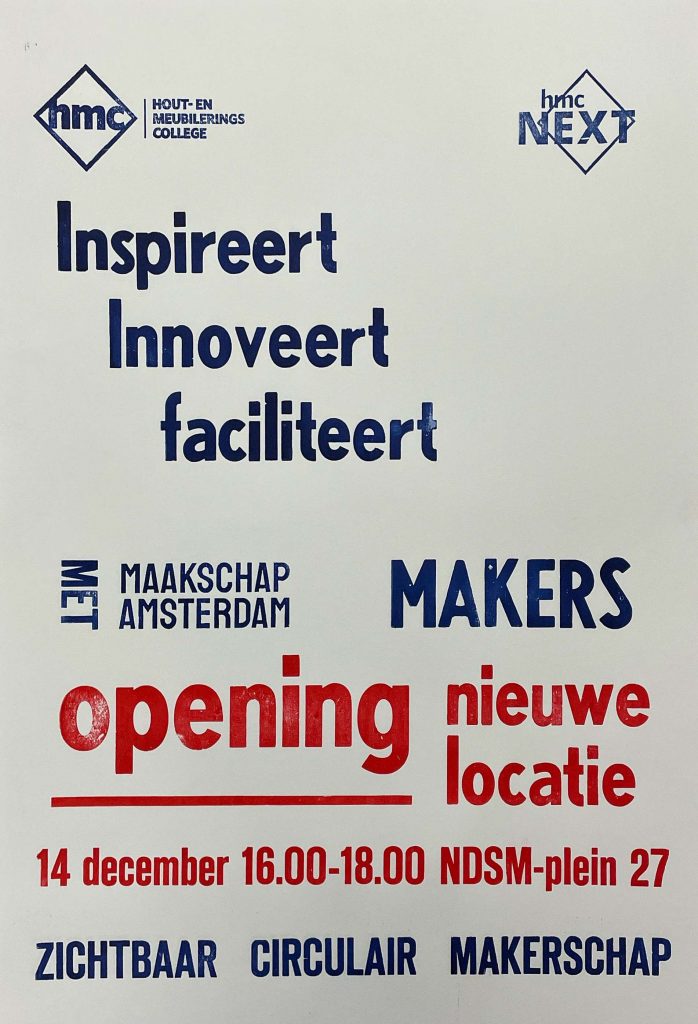 Op de NDSM-werf in Amsterdam Noord wordt gewerkt aan een nieuwe plek voor HMC’ers en makers uit de stad. Deze plek, satelliet genoemd, zal de aankomende tijd ruimte bieden aan verschillende activiteiten op het gebied van makerschap, met als doel de zichtbaarheid hiervan in de stad te vergroten en bevorderen. Zo zullen het HMC en HMC Next hier innovatieve vormen van onderwijs verzorgen. Ook zal het activiteiten ontwikkelen samen met én voor makers uit de buurt gericht op het enthousiast maken voor het makerschap. Daarnaast werken we met samenwerkingspartners aan activiteiten om makers te ondersteunen om meer circulair te gaan werken. Het HMC wil met deze plek de brug slaan tussen het onderwijs, de branche en de maatschappij.