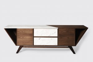 Tijdens dit project wilde ik werken met, voor mij, nieuwe materialen. Die materialen moesten elkaar complimenteren en het eindproduct moest een aandachtstrekker worden. Ik ben gek op subtiele details. Deze zijn dan ook overal in het dressoir terug te vinden. Werp maar eens een blik op het onderstel waar overal messing details zitten. Of het bovenblad waar de scheiding tussen de solid surface (Bianca Carrara Bruno) en het Amerikaans notenhout ook weer een messing detail is.