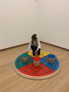 ‘Het HMC en Stedelijk Museum hadden een aantal eisen opgesteld. Het moest interactief zijn en mocht het niet uit lossen delen bestaan. Op Pinterest ben ik op zoek gegaan naar ideeën en kwam een houten speelgoedtrein tegen op een rails. Dit inspireerde me. Mijn ontwerp is dan wel niet met een trein, maar met stoeltjes. De kleuren wilde ik graag herkenbaar en aantrekkelijk maken voor kinderen; dit is geïnspireerd op de kleuren van Dick Bruna.’