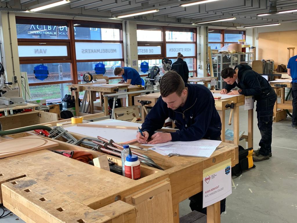 Wie vorige week bij de open dag van HMC Amsterdam was, kan het bijna niet gemist hebben: de kwalificatiewedstrijd voor meubelmakers van Skills Heroes vond op school plaats. Twee dagen lang streden in totaal 14 deelnemers van verschillende mbo’s in Nederland voor een plek bij Skills the Finals. Er deden twee studenten van het HMC mee en zij zijn alle twee door naar de finale. Wat een prestatie!