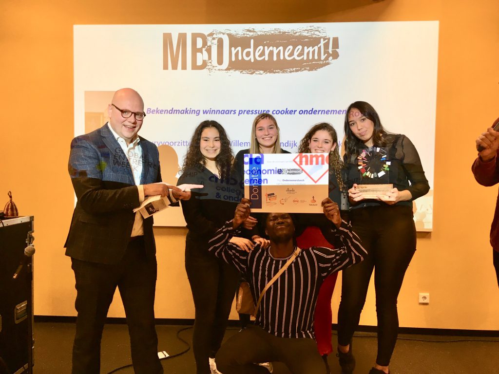 Naast al die pitches en prijzen was er een spoken word-act van Sir Culair over ondernemen, waar studenten al rappend op aanhaakten. Ook konden studenten vragen stellen aan een ondernemersforum met o.a. oud-student van het HMC en meubelontwerper Sjoerd Vroonland. Comedian Edson Da Graca wist als host alles in goede banen te begeleiden. De week stond in het teken van teamwork, ontwerpen, produceren, netwerken, jezelf verkopen, presenteren, durven maar vooral ook over plezier hebben en doen! “Iedereen zei dat ons idee niet goed genoeg zou zijn,’ zegt een opgeluchte en trotse Novitha, groepslid van het winnende team. “Maar zo zie je maar weer, wij staan hier met de bokaal. Soms moet je gewoon vertrouwen hebben in jezelf!”