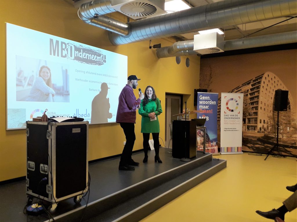 “Jullie zijn allemaal winnaars”. Met deze loftuiting opende de Rotterdamse wethouder van Economische Zaken Barbara Kathmann op vrijdag 22 november de laatste dag van het ondernemersevent MBOnderneemt! Daarmee begroette ze de ruim 150 studenten van het Hout- en Meubileringscollege en Albeda College Economie & Ondernemen die zich tijdens de Global Entrepreneurship Week inspanden om het beste ondernemersidee van mbo-studerend Rotterdam te bedenken.