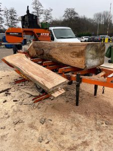 Het zagen werd gedaan met een mobiele bomenzaag. Dit is een horizontale lintzaag die naar de locaties wordt gereden. Zo kan deze, bijv. in een bos, een stam aan planken zagen. De boomstammen werden op ongeveer 36 mm dikte gezaagd, zodat de plank na het drogen op ongeveer 32 mm uitkomt. Dit is een natuurlijk proces wat kan afwijken en afhankelijk is van de relatieve luchtvochtigheid buiten. Hout droogt ongeveer 1 cm per kant per jaar. Deze planken hebben zeker 1,5 jaar nodig om natuurlijk droog te worden.