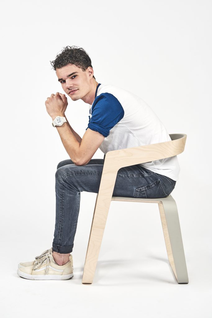 ‘Vanuit school mochten we zelf bedenken wat we als eindwerkstuk wilden maken, maar we moesten dit idee wel kunnen onderbouwen. Ik heb een materiaalonderzoek gedaan, want ik was op zoek naar makkelijk te verbuigen materiaal. Met dit buigzame materiaal wilde ik mijn eindwerkstuk gaan maken en op basis hiervan ben ik gaan schetsen en ontwerpen. Ik heb een soort kruk gemaakt met een rugleuning ineen. De stof die op de stoel zit nodigt uit om te gaan zitten. De stoel is van buiten afgewerkt met beuken en van binnen met lynoleum dekstop. Dit materiaal is mat en subtieler dan wanneer je de stoel gelijk stoffeert. Ik wilde dicht bij het ontwerp blijven. Ik heb de mallen van de stoel met de CNC gemaakt en de stoel uiteindelijk met de hand gemaakt. Ik vind het erg gaaf dat in mijn eindwerkstuk ambacht en technologie mooi samen komen.’