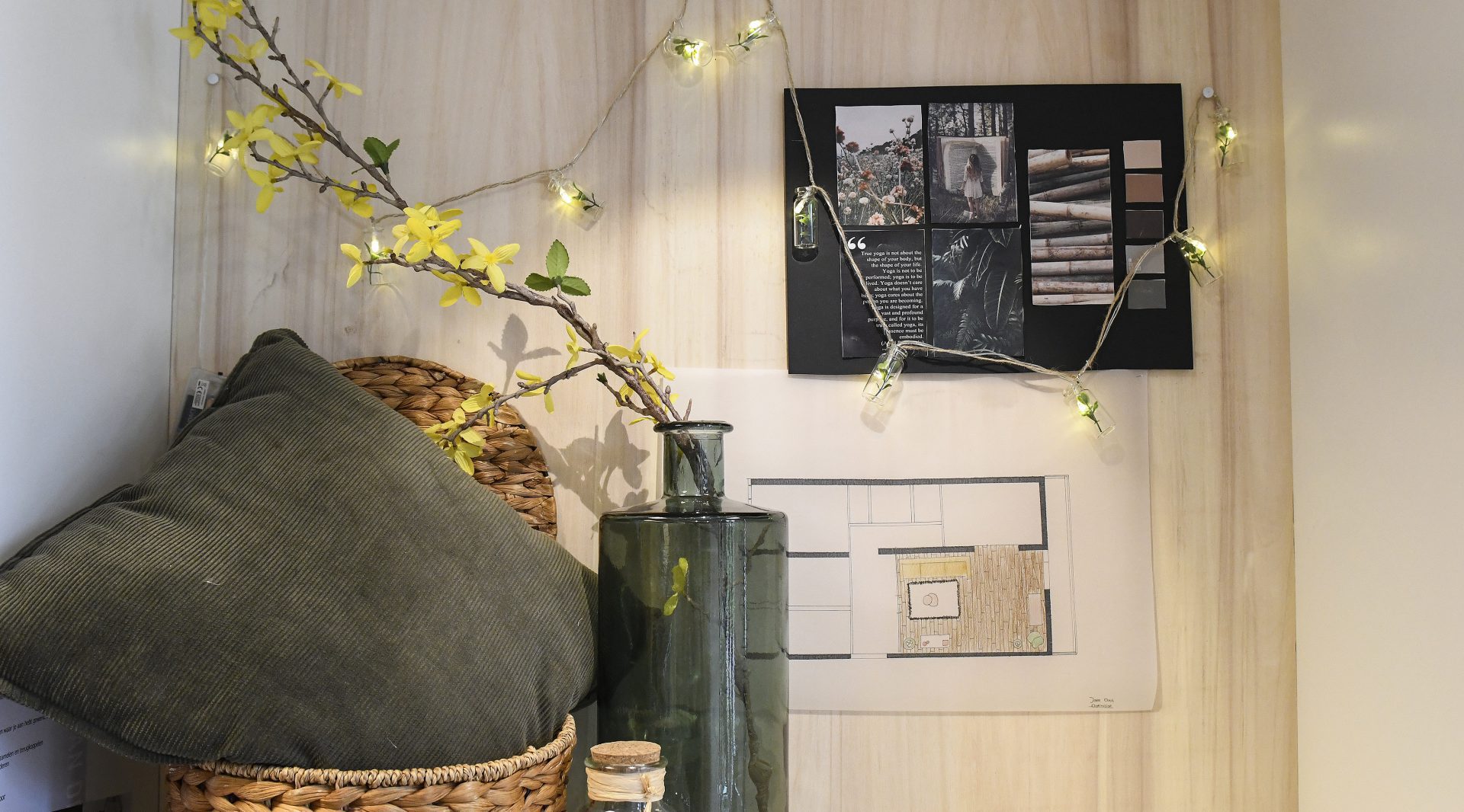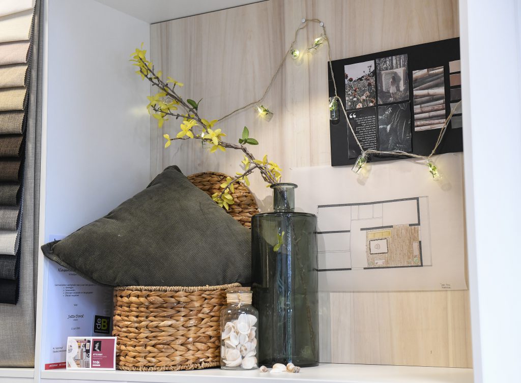 ‘Als eindopdracht kregen we vanuit school een klant toegewezen. Met de klant voerde ik diverse klantgespreken, om een goed beeld te krijgen van de wensen van de klant. De stijl van de klant was bohemien. Ze hield van natuurtinten en rustgevende materialen. Ik heb hiervoor een artikelpresentatie gemaakt waarin de diverse kleurtinten en materialen mooi samen komen. Het was soms best een uitdaging om je eigen smaak en stijl los te laten, uiteindelijk moet je echt denken vanuit de klant.’