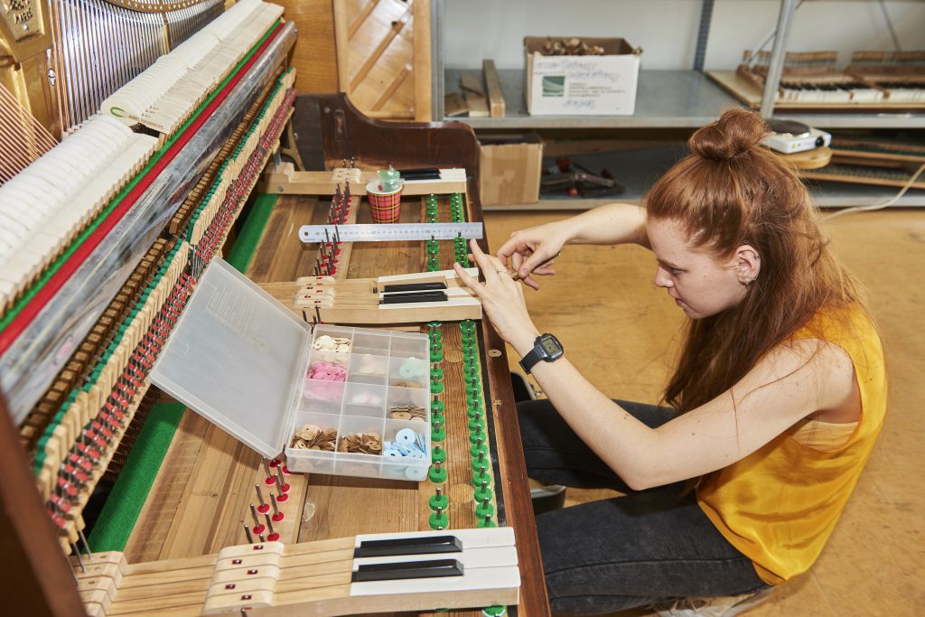 ‘Tijdens de opleiding werk je in groepjes aan projectpiano’s. Dit zijn instrumenten die door de branche aan de school worden toevertrouwd. Daaraan moet je alles doen, van materialen bestellen tot materialen vervangen, tot afstellen, tot stemmen. Ook maak je nog een octaafpiano en een scriptie, heel leuk en leerzaam. In het derde jaar krijg je de tijd om je helemaal te wijden aan vleugels. Daar ga ik me nu ook nog verder in verdiepen. Met mijn stagebegeleider ga ik naar China om mij verder te specialiseren op het vlak van vleugeldemping. Na een vakantie ga ik daarna écht aan het werk, bij mijn stagebedrijf Maene in Belgie.’